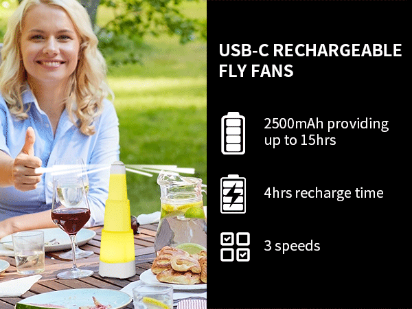 - 【USB Rechargeable Fly Fans】Equipped with a powerful 2500mAh Li-ion battery, this fly fan boasts a quick 4-hour recharge time, providing up to 15 hours of continuous use. It can be used while charging or after a full recharge. The fly fan offers 3 speeds; when camping, picnicking, or dining outdoors, the first speed is sufficient. If there are many flies, higher speeds can be considered.